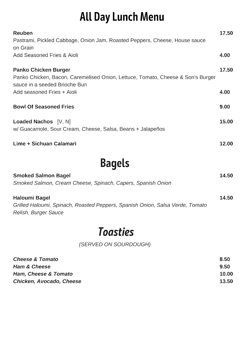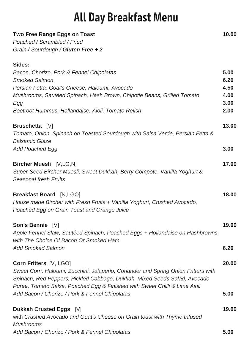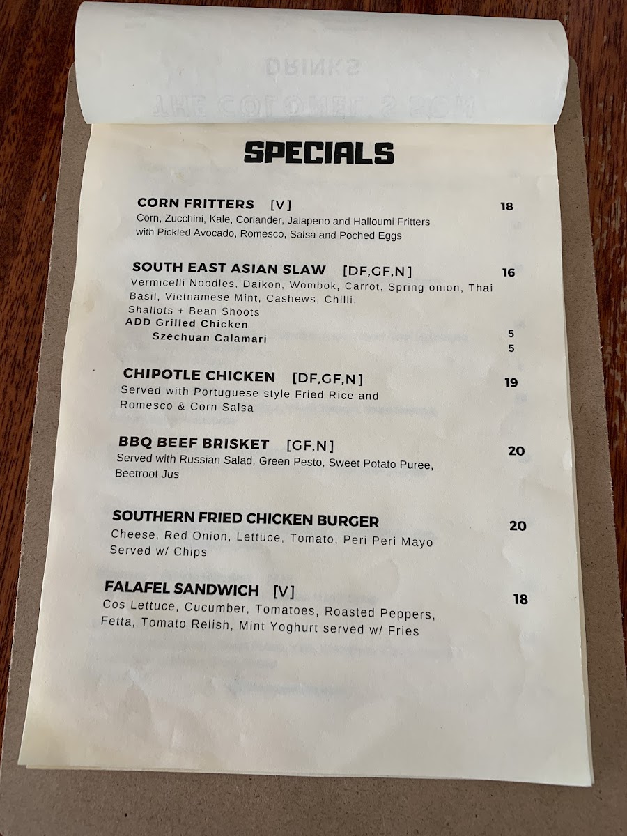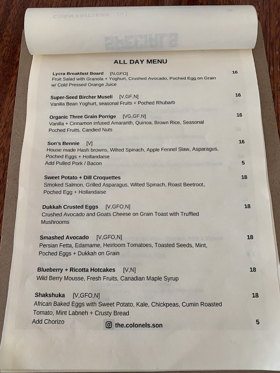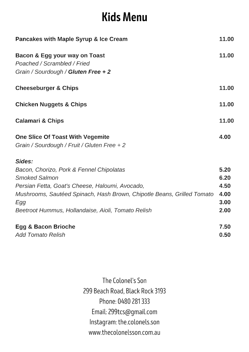 The menu at The Colonel's Son offers a delightful selection of breakfast, lunch, and beverage options, catering to various tastes. For breakfast, you can enjoy the indulgent Ricotta Hotcakes, the wholesome Bircher Muesli, or the fresh Smashed Avocado. The Son's Benny with Ham and the ever-popular Bruschetta are also standout options to start your day. The drinks menu is equally inviting, with a variety of coffee choices like Latte, Magic, and Matcha Latte, as well as soothing beverages like Turmeric Latte and Long Black. For those craving something cooler, there are refreshing Iced Coffee, Milkshakes, and Iced Chocolate, alongside Spring Water and Soft Drinks. The toasties and bagels section features a Haloumi Bagel and a Smoked Salmon Bagel, offering satisfying bites. For lunch, hearty choices include the Chipotle Chicken Sandwich, the crispy Panko Chicken Burger, and light yet filling salads such as the Calamari Salad and Moroccan Lamb Salad, with a vibrant Super Salad rounding off the selection. The prices for many dishes aren’t listed, but the menu promises a satisfying meal that combines flavorsome dishes with a cozy atmosphere.