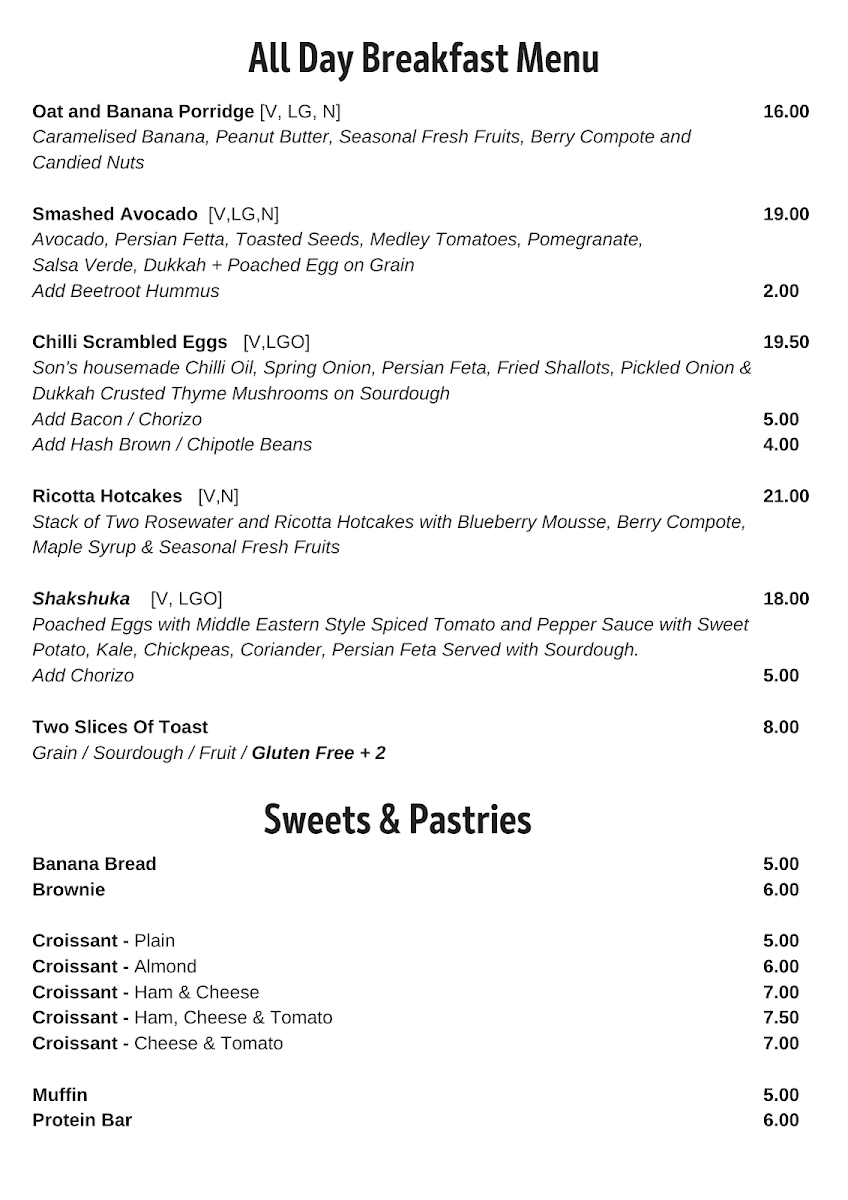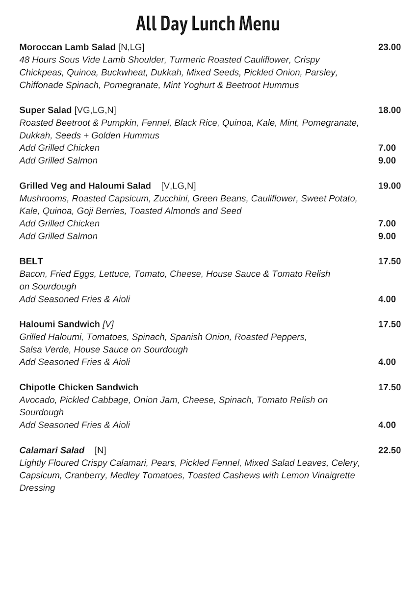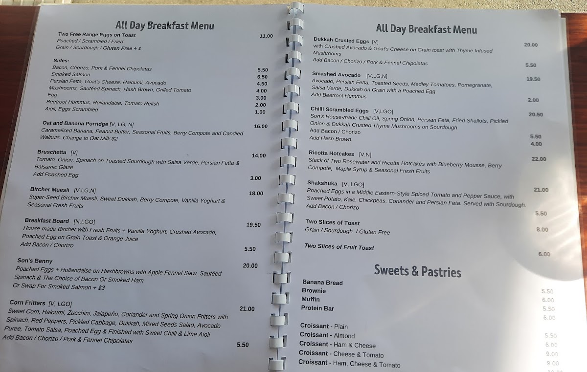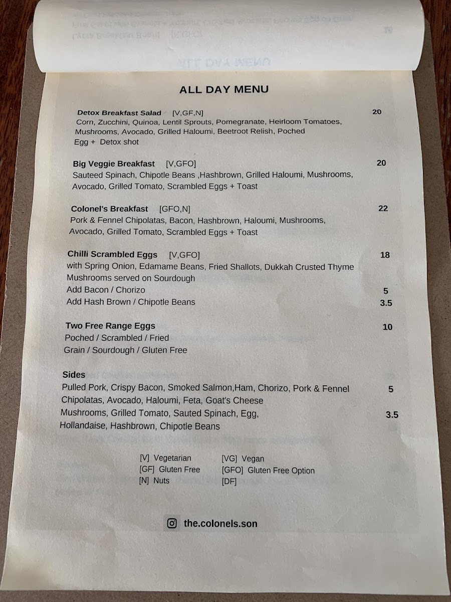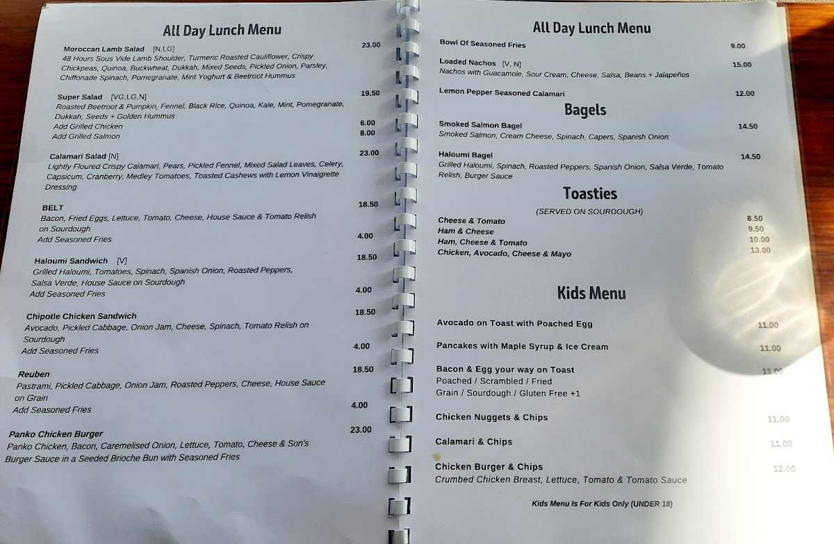 The menu at The Colonel's Son offers a delightful selection of breakfast, lunch, and beverage options, catering to various tastes. For breakfast, you can enjoy the indulgent Ricotta Hotcakes, the wholesome Bircher Muesli, or the fresh Smashed Avocado. The Son's Benny with Ham and the ever-popular Bruschetta are also standout options to start your day. The drinks menu is equally inviting, with a variety of coffee choices like Latte, Magic, and Matcha Latte, as well as soothing beverages like Turmeric Latte and Long Black. For those craving something cooler, there are refreshing Iced Coffee, Milkshakes, and Iced Chocolate, alongside Spring Water and Soft Drinks. The toasties and bagels section features a Haloumi Bagel and a Smoked Salmon Bagel, offering satisfying bites. For lunch, hearty choices include the Chipotle Chicken Sandwich, the crispy Panko Chicken Burger, and light yet filling salads such as the Calamari Salad and Moroccan Lamb Salad, with a vibrant Super Salad rounding off the selection. The prices for many dishes aren’t listed, but the menu promises a satisfying meal that combines flavorsome dishes with a cozy atmosphere.